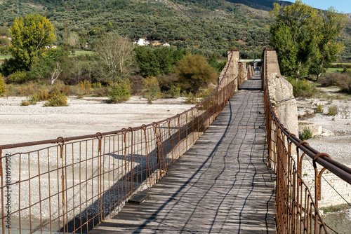 Zentraler Blick entlang der Ali-Pasha-Hängebrücke über das Flussbett, Tepelena, Gjirokastra, Albanien