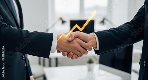 Empresarios dándose un apretón de manos con una flecha naranja de crecimiento