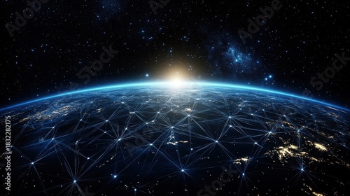 A glowing global network connects the earth from space with bright lights illuminating the dark universe and distant stars