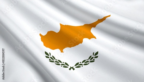 Cyprus flag with white background, copper-orange island silhouette, and crossed green olive branches beneath.