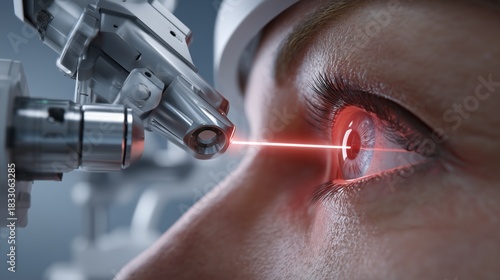 Ultra-realistic scene of a laser glaucoma treatment in a modern ophthalmology clinic, precise laser device pointed at patient’s eye, soft glow from laser, sharp medical detail
