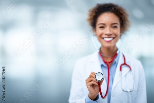 Smiling doctor holding stethoscope toward camera in bright clinic interior; open posture and direct eye contact convey trust, preventive care messaging and patient engagement