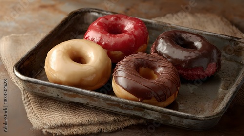 Gourmet donuts on a vintage metal tray, an indulgent treat for any occasion