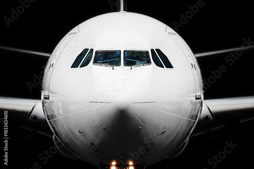 Close up front view of a large commercial airliner nose section against a dark background