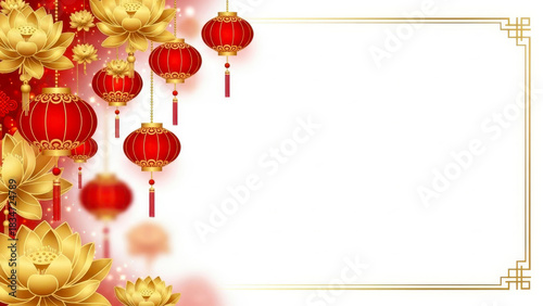 Festive red lanterns and golden flowers adorn a decorative frame for chinese new year celebrations