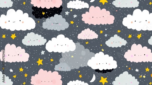 Soft happy clouds in pink white and gray float across a dark sky filled with cheerful stars. The scene evokes a joyful whimsical atmosphere perfect for kids' rooms or playful themes.