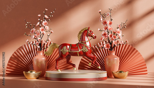 Festive Lunar New Year 3D product display with auspicious red horse and cherry blossoms.
