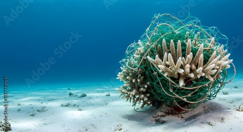 A ghost fishing net entangling a dying coral on the ocean floor, highlighting the critical ecology impact concept of marine pollution