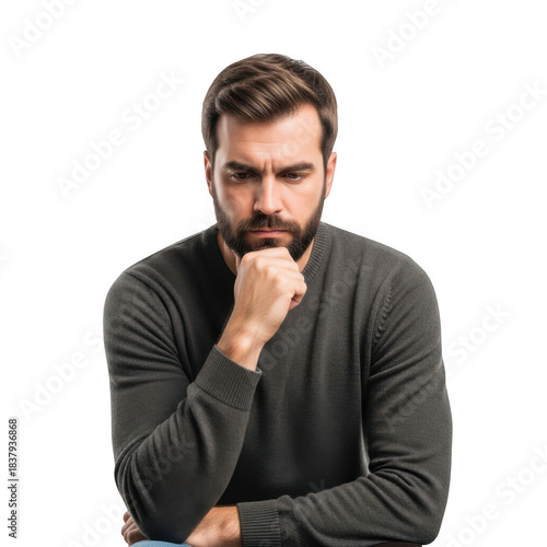 Thoughtful bearded man pondering deeply with chin resting on hand