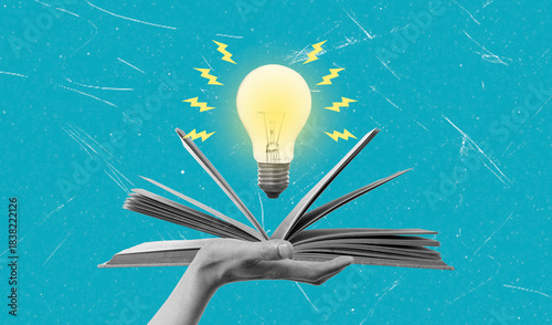 Bright light bulb above open book with hand holding it in simple design against blue background