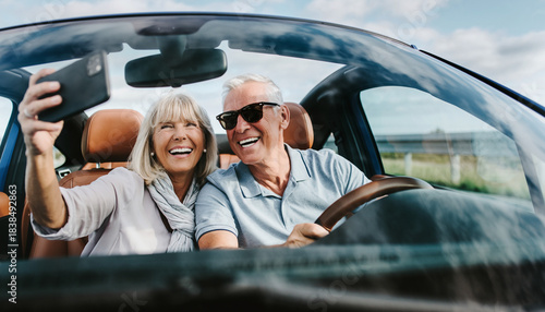 Para seniorów robiących sobie selfie podczas jazdy kabrioletem