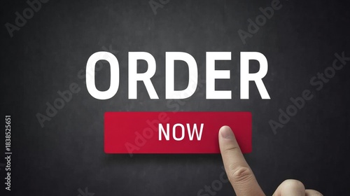 Digitally created image of the word "ORDER" above a red button labeled "NOW", finger pointing