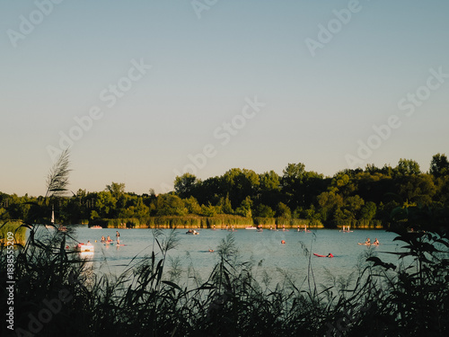 People engaging in various water sports on serene lake, surrounded by lush vegetation and bathed in golden light of setting sun, creating tranquil and idyllic summer scene. Summer outdoor recreation