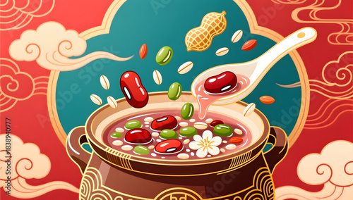 Laba porridge ingredients highlighted in ornate Chinese patterns