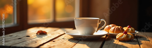 warm golden light falls upon rustic wooden table revealing delicate china tea set amidst soft velvety pastries intricate wood