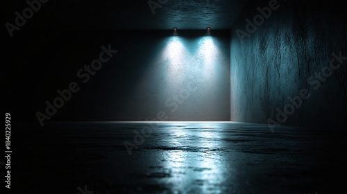 The illumination of a bare stage with two spotlights, emphasizing a sense of mystery and potential