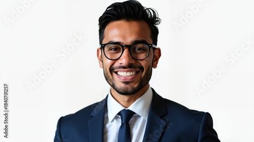 Portrait of a handsome young businessman in suit, smiling on face with glasses, isolated on transparent background. Arabic style. Muslim businessman.