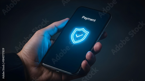 Hand holds smartphone displaying glowing security shield checkmark icon ensuring safe digital payment transaction on dark technology background concept