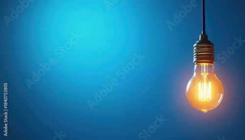 Single glowing light bulb hangs against vibrant blue gradient background. Symbolizes bright new idea, invention, inspiration, and creative thinking. Represents illumination, knowledge, and energy.