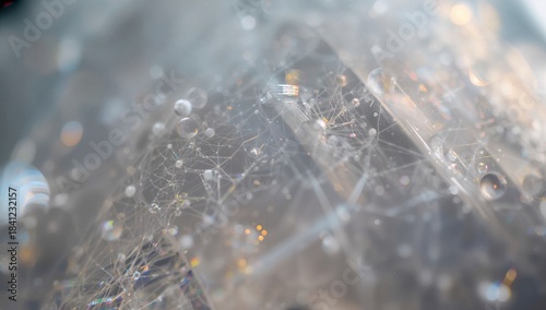Showing central filaments holding droplets refracting rainbow highlights in macro, bokeh