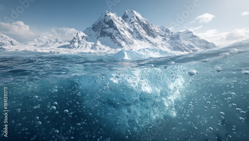 Ocean water surface with detailed underwater view of rising bubbles and distant snow-covered mountain peaks under a cloudy sky