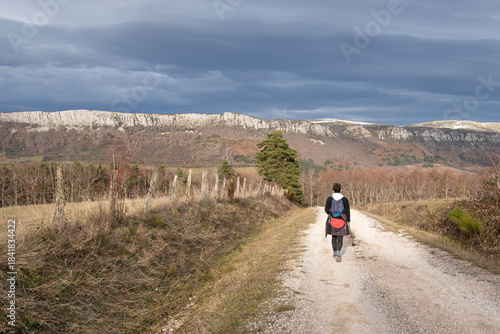 Hiker walking in the Aezkoa Valley. Abodi mountain range in the background. Navarrese Pyrenees