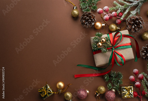 Christmas background with handmade gift box with bow, decorative fir branch, ball and cones for tree decoraton. New Year winter holiday composition with presents, decor and space for text, top view.