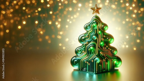 abstract spiral green Christmas tree made by circuit board elements blends festive spirit with modern technology. digital structure, glowing lines, and PCB-inspired shapes create a futuristic holiday