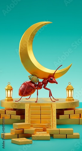 Whimsical Red Ant Carrying Moon on Golden Platform