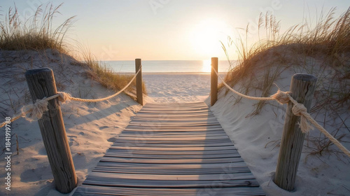 sunrise boardwalk illustration through sand dunes leading to beach with rope railing and tall grasses