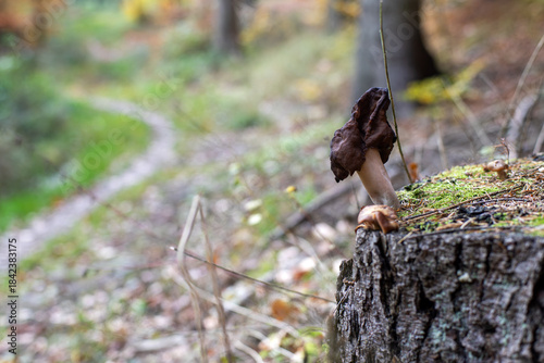 Pomarszczony brązowy grzyb rosnący na starym pniu ściętego drzewa