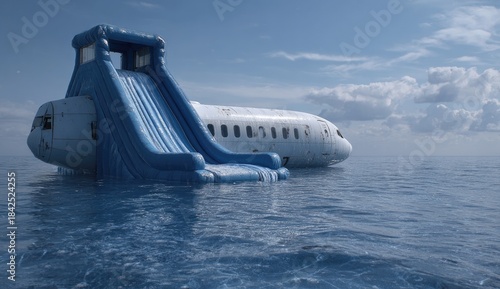 Inflatable slide attached to a disabled airplane fuselage floating at sea
