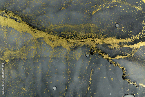 Abstrakcyjne tło stworzone za pomocą tuszy alkoholowych ze złotym brokatem, tworzące organiczne, rozlewające się kształty i efektowne metaliczne refleksy.