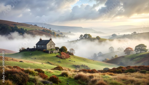 Illustration of a serene countryside landscape with a house on a hill surrounded by foggy rolling hills and trees at sunrise