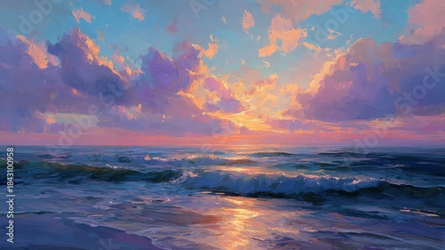 Vibrant ocean sunset with dramatic clouds. Artificial intelligence image