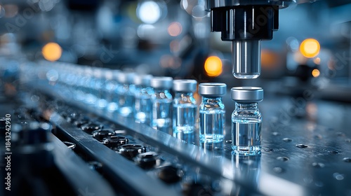 Automated Pharmaceutical Production Line Filling Vials with Medicine.