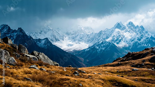 A picturesque landscape featuring a rocky foreground a valley and majestic snow-capped mountains under a cloudy sky