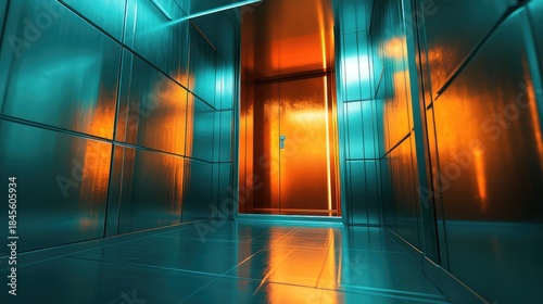 Modern metallic hallway with brushed panels reflecting contrasting teal and warm orange light, creating an exciting and mysterious atmosphere moving towards a bright, glowing door