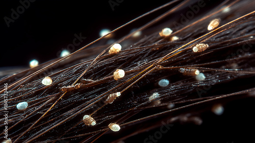 Macro view of lice nits attached to dark brown hair strands close up eggs