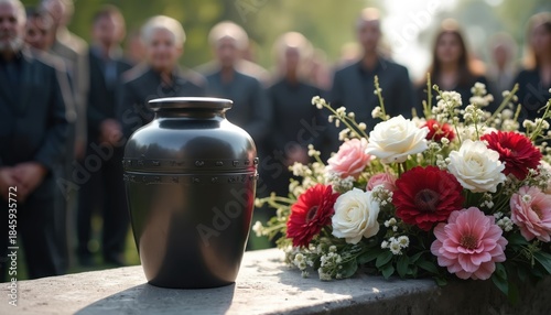 Funeral urn with cremains and flowers. Mourners stand in blurred background at memorial service, last farewell to deceased person. Grief and sadness at burial.