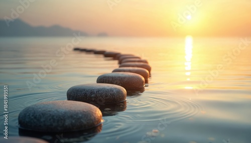Smooth stones make pathway in calm water. Sun sets over ocean horizon creating golden reflection. Peaceful journey forward. Represents progress and mindful steps.