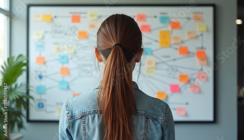 Woman looks at whiteboard with many sticky notes. She plans strategy on colorful papers. She uses systems thinking for project management. She analyzes complex data. Her workflow is organized.