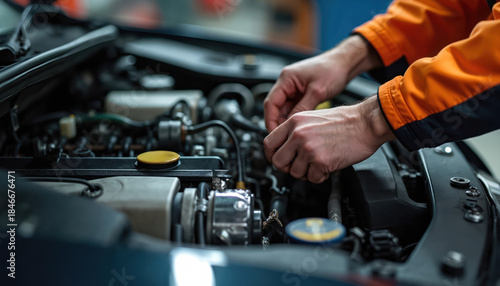 Mechanic repairs auto engine using tools in garage. Hands fix car engine part. Pro auto mechanic service. Vehicle maintenance job. Automotive repair.