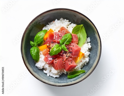 delicious rice bowl with tuna vegetables and fresh basil on a white isolated background