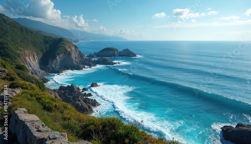 Rugged coastline meets clear blue ocean waves crashing on rocky shores under a bright sunny sky. Lush green hills and mountains ascend from the seaside panorama.