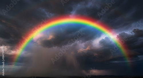 Spectacular rainbow arching across a dramatic stormy sky with dark clouds and vibrant colors