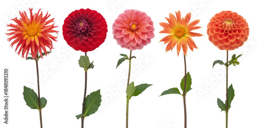 Five colorful dahlias flowers isolated isolated on a transparent background