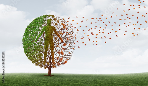 Human Aging Process and deteriorating health or reduced wellbeing as physical decline or weakening body condition due to chronic pain and disease represented by a tree in the fall.