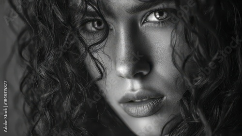 Captivating Gaze: A close-up portrait unveils a woman with curly hair, the monochrome enhancing the intensity of her eyes.