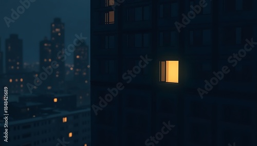 Minimal architectural illustration of a single lit window in a massive dark apartment building, urban loneliness and modern isolation concept, geometric composition, night mood